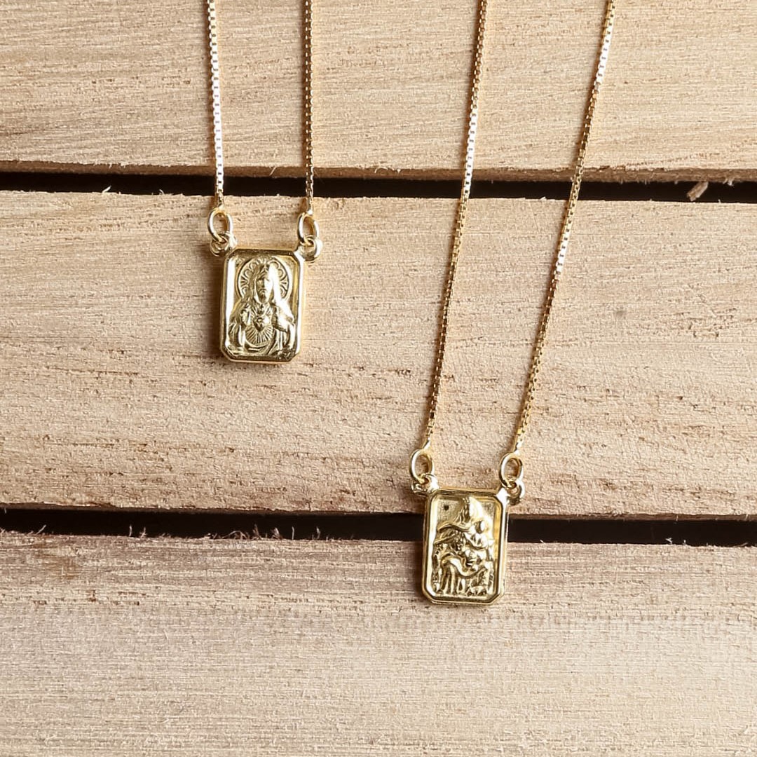 Escapulário Ouro 18k 60cm. Apresentamos o nosso lindo escapulário simples em ouro. Os escapulários são peças características por sua malha simples e medalhas com imagem de Nossa Senhora de Aparecida e o Sagrado Coração de Jesus nas extremidades da corrente. As medalhas possuem formato retângulas, lembrando pequenos quadros que compõe esta peça poderosa. Sem adornos ou mais detalhes, o escapulário é uma peça ótima para diversas composições e complementa qualquer combinação. É perfeito tanto para ele quanto para ela, servindo como amuleto de proteção.